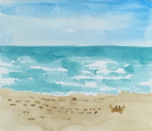 Pelicans gliding and diving, dolphins swimming up and down the coast, sandpipers pecking at water’s edge, crabs appearing in and out of holes, sea turtles tracks marking night time journeys. The web of ocean and beaches abundant life if we but open our eyes.